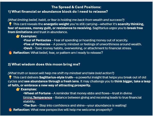 Example: Ten of Wands: You’re doing too much alone. Ask for help. Let something go. The weight you release now will make space for everything you actually want to carry.